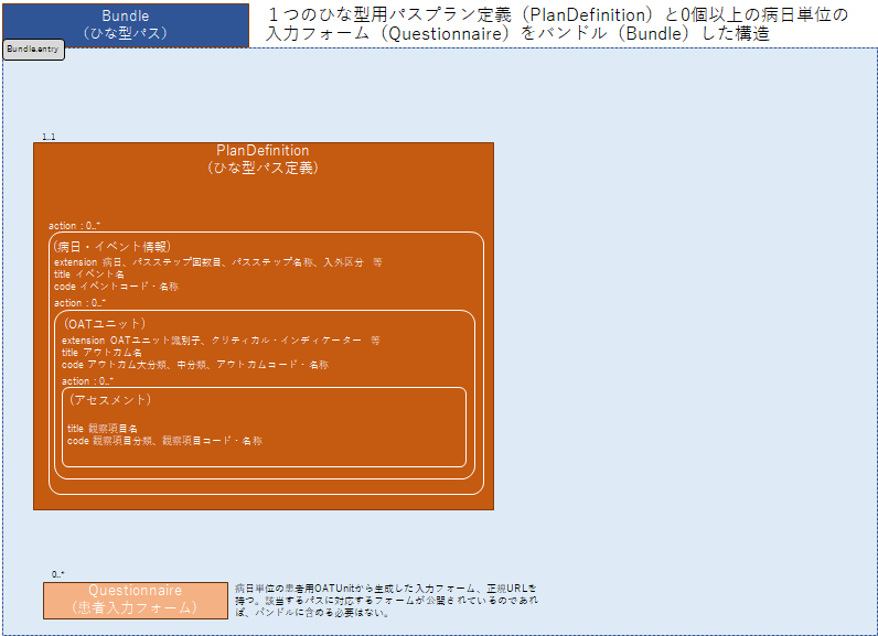 ひな型パスバンドルでは、パス適用情報、病日・イベント情報、OATユニット/アウトカム、観察項目のePathデータ構造を PlanDefinitionリソース で表現する。外来パスの入力フォームは、Questionnaireリソース で表現する。