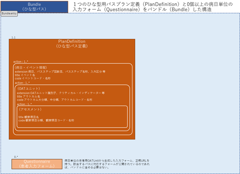 ひな型パスバンドルでは、パス適用情報、病日・イベント情報、OATユニット/アウトカム、観察項目のePathデータ構造を PlanDefinitionリソース で表現する。外来パスの入力フォームは、Questionnaireリソース で表現する。