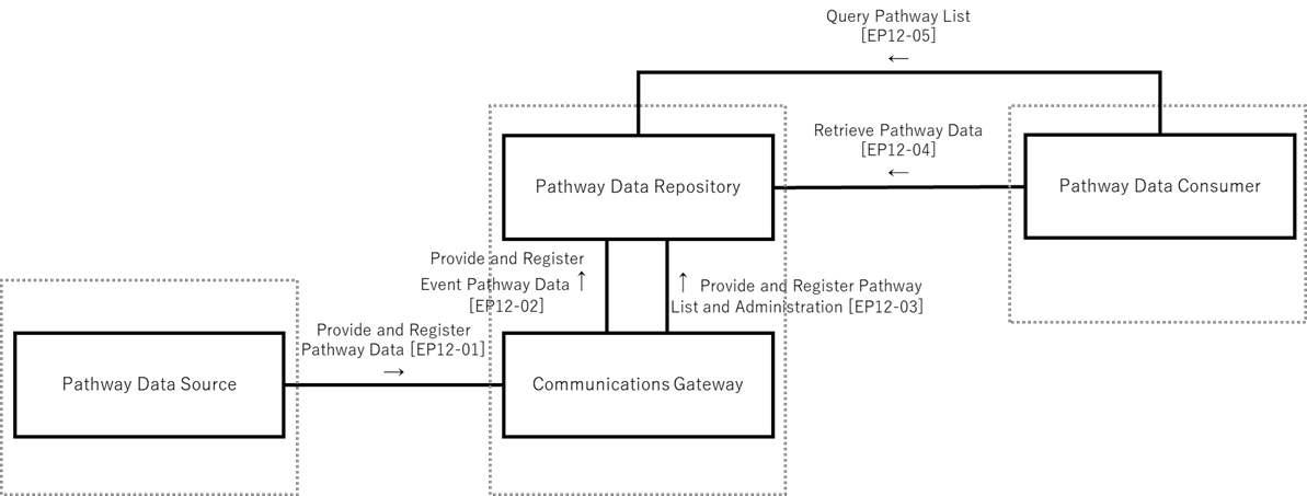 | EP12-03 | Provide and Register Pathway List and Administration | EPath List EPathRepository | 適用後パスデータリストをePathリポジトリに登録する。 他に登録の経路がない場合、医療機関情報や患者基本情報も登録する。 |